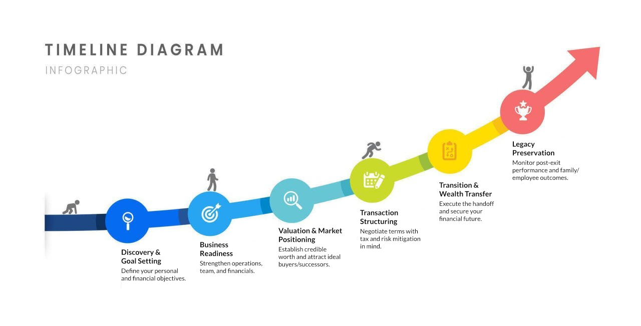 - Exit Strategy Planning: Craft a customized roadmap for your ideal exit, whether selling to a strategic buyer, merging with a competitor, or stepping back while retaining income. We align timing, structure, and goals to optimize outcomes.
